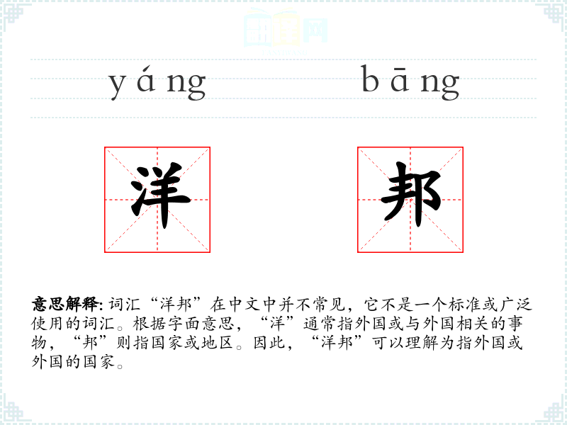 “洋邦”这个词可能是由“洋”和“邦”两个字组合而成,用来指代外国国家。在现代汉语中,这个词并不常见,可能在一些特定的文献或历史文本中出现。
