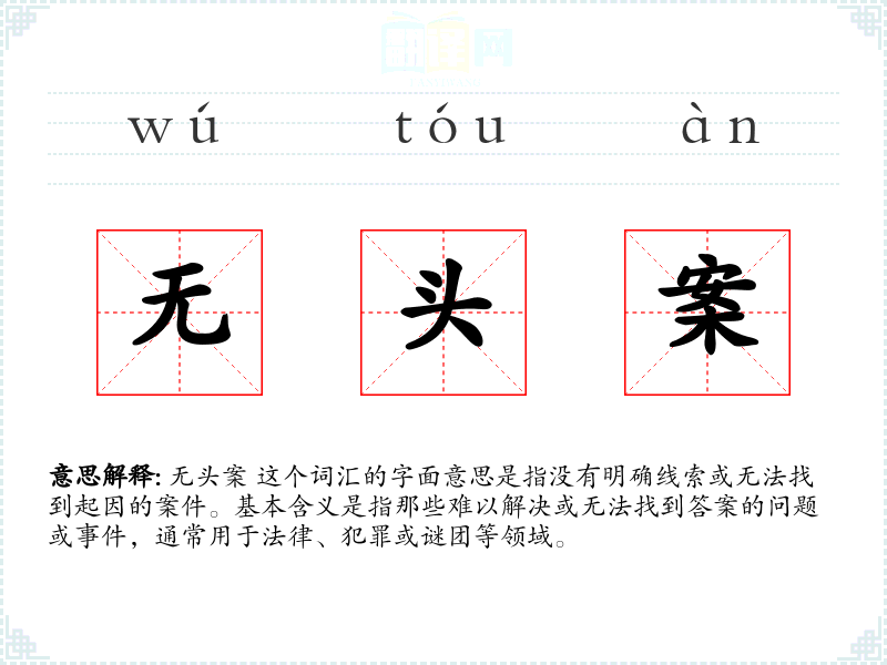无头案 这个词汇的字面意思是指没有明确线索或无法找到起因的案件。基本含义是指那些难以解决或无法找到答案的问题或**,通常用于法律、犯罪或谜团等领域。