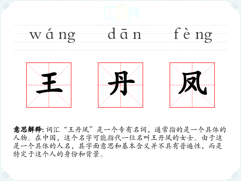 - 不同语言或文化中的对应词汇:在其他文化中,可能没有直接对应的名字,但可以通过翻译了解其含义,如在英文中可能是“Wang Danfeng”。