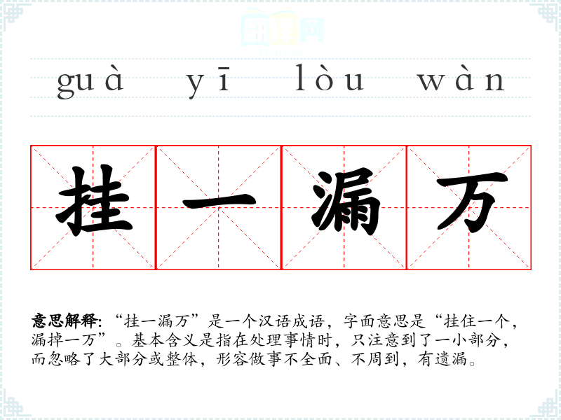 “挂一漏万”是一个汉语成语,字面意思是“挂住一个,漏掉一万”。基本含义是指在处理事情时,只注意到了一小部分,而忽略了大部分或整体,形容做事不全面、不周到,有遗漏。