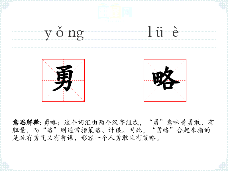 勇略:这个词汇由两个汉字组成,“勇”意味着勇敢、有胆量,而“略”则通常指策略、计谋。因此,“勇略”合起来指的是既有勇气又有智谋,形容一个人勇敢且有策略。