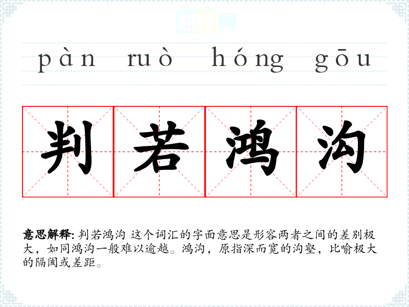 判若鸿沟 这个词汇的字面意思是形容两者之间的差别极大,如同鸿沟一般难以逾越。鸿沟,原指深而宽的沟壑,比喻极大的隔阂或差距。