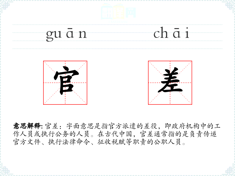 - 专业领域:在法律或历史学术语境中,官差可能被用来指代特定历史时期的官方执行人员。