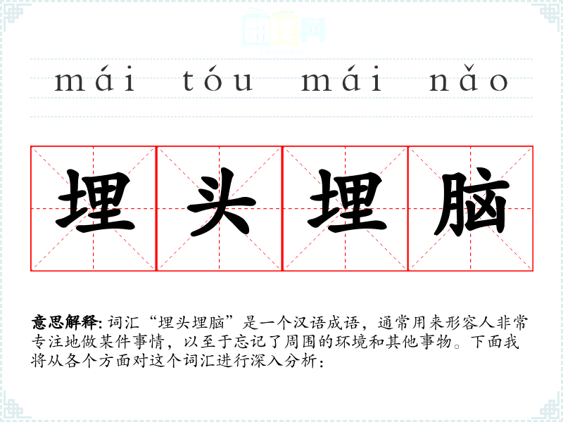 词汇“埋头埋脑”是一个汉语成语,通常用来形容人非常专注地做某件事情,以至于忘记了周围的环境和其他事物。下面我将从各个方面对这个词汇进行深入分析: