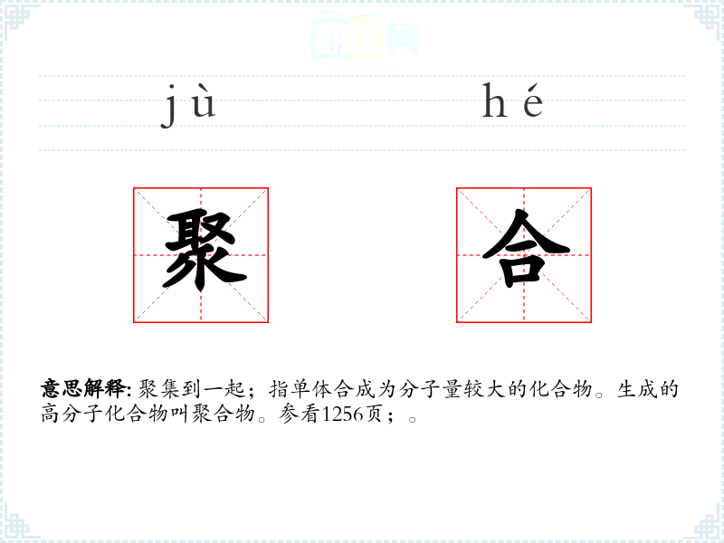 聚集到一起;指单体合成为分子量较大的化合物。生成的高分子化合物叫聚合物。参看1256页;。