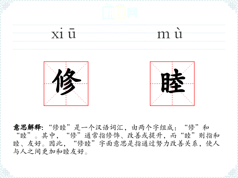 “修睦”是一个汉语词汇,由两个字组成:“修”和“睦”。其中,“修”通常指修饰、改善或提升,而“睦”则指和睦、友好。因此,“修睦”字面意思是指通过努力改善关系,使人与人之间更加和睦友好。