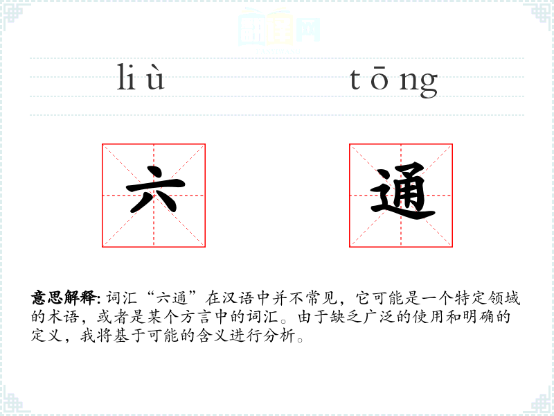 词汇“六通”在汉语中并不常见,它可能是一个特定领域的术语,或者是某个方言中的词汇。由于缺乏广泛的使用和明确的定义,我将基于可能的含义进行分析。