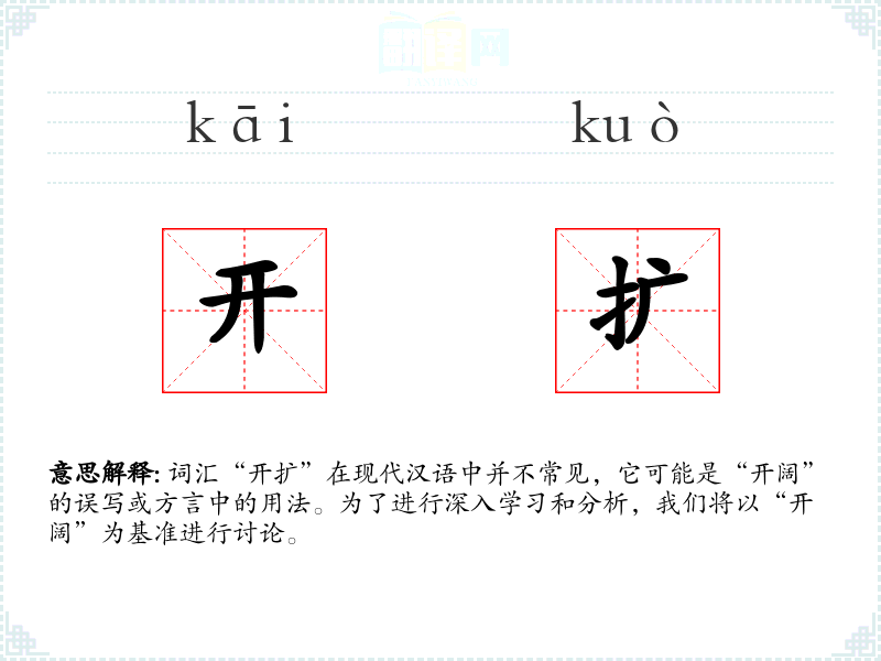词汇“开扩”在现代汉语中并不常见,它可能是“开阔”的误写或方言中的用法。为了进行深入学*和分析,我们将以“开阔”为基准进行讨论。
