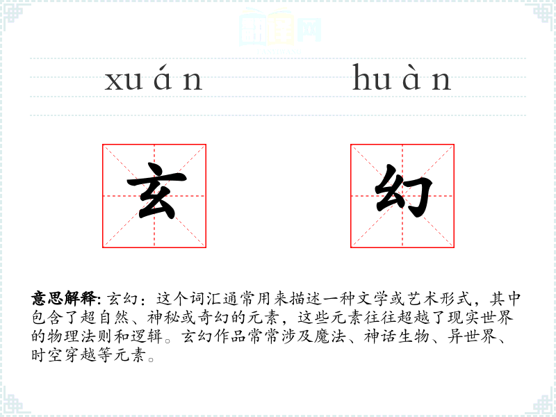 玄幻:这个词汇通常用来描述一种文学或艺术形式,其中包含了超自然、神秘或奇幻的元素,这些元素往往超越了现实世界的物理法则和逻辑。玄幻作品常常涉及魔法、神话生物、异世界、时空穿越等元素。