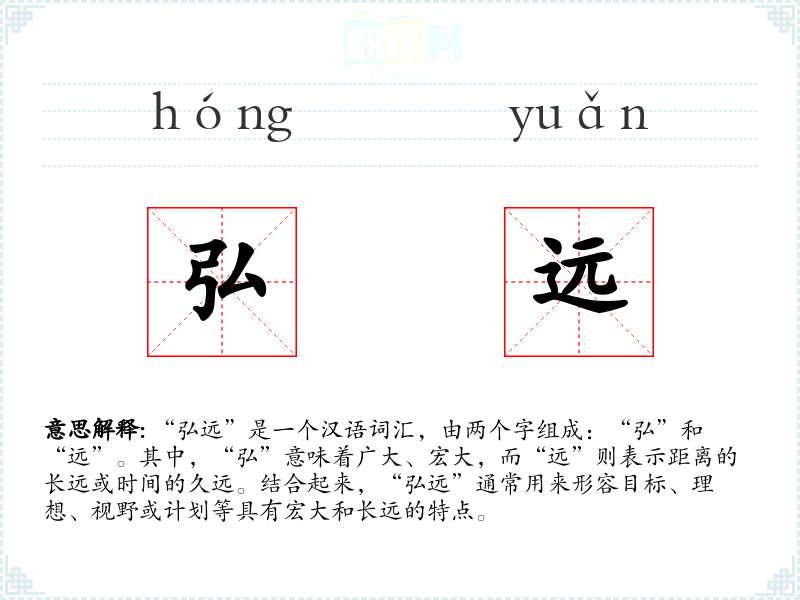 “弘远”作为一个复合词,其字面意义直接来源于“弘”和“远”的组合。在古代汉语中,“弘”常用来形容声音的宏大,而“远”则表示距离的远。随着语言的发展,这两个字组合起来形成了“弘远”,用来形容更抽象的概念,如理想、视野等。
