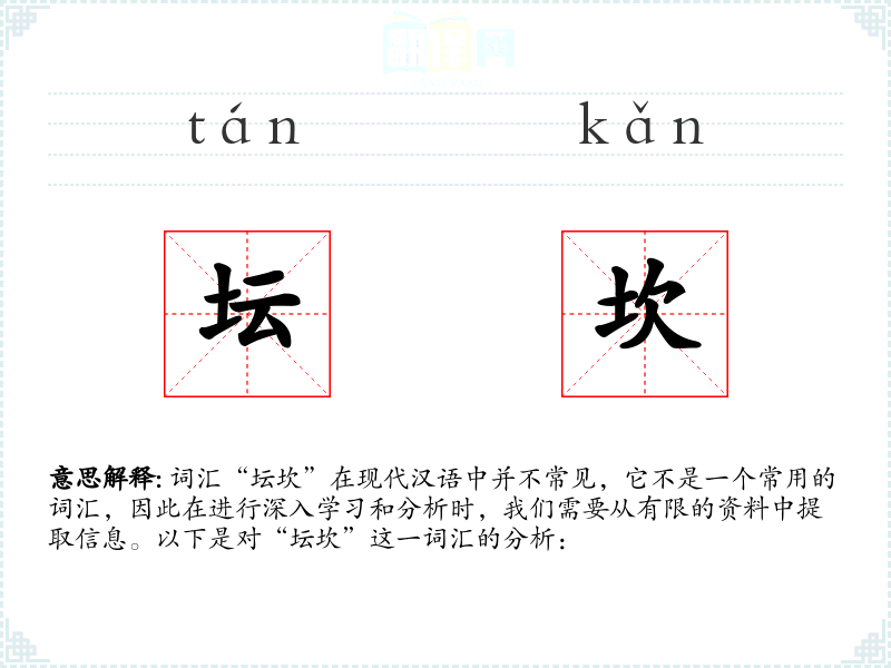 “坛坎”这一词汇在现代汉语中并不常见,其含义和用法需要进一步的语境分析和研究。在语言学习和表达中,了解和掌握常用词汇更为重要,而这类不常见的词汇可能在特定的语境和领域中才有其价值。