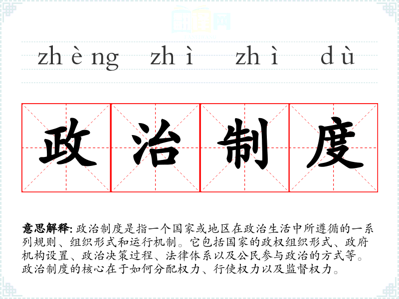 政治制度是指一个国家或地区在政治生活中所遵循的一系列规则、组织形式和运行机制。它包括国家的政权组织形式、政府机构设置、政治决策过程、法律体系以及公民参与政治的方式等。政治制度的核心在于如何分配权力、行使权力以及监督权力。
