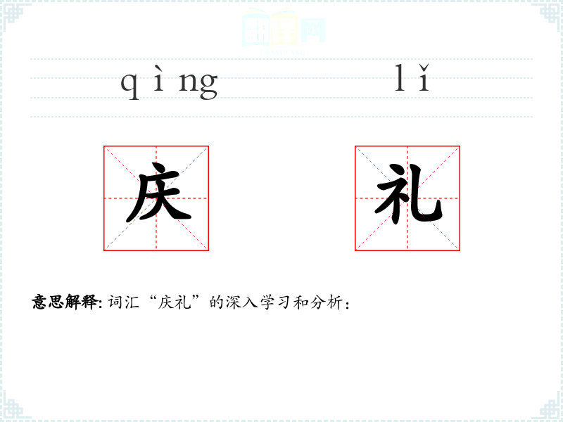 - 文学:在文学作品中,“庆礼”可能被用来描述节日庆典的盛况,如春节、婚礼或国家庆典。