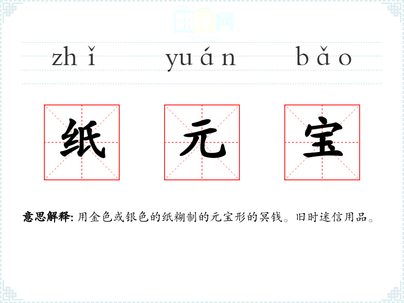 用金色或银色的纸糊制的元宝形的冥钱。旧时迷信用品。