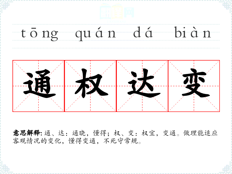 通、达:通晓,懂得;权、变:权宜,变通。做理能适应客观情况的变化,懂得变通,不死守常规。