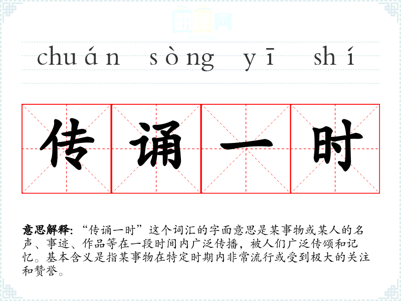 “传诵一时”这个词汇的词源较为传统,其中“传诵”一词源自古代汉语,意为传播和颂扬,而“一时”则表示一段时间。这个词汇在古代文献中已有使用,随着时间的推移,其含义和用法逐渐固定下来,成为描述某事物在一段时间内广泛传播和赞誉的常用表达。