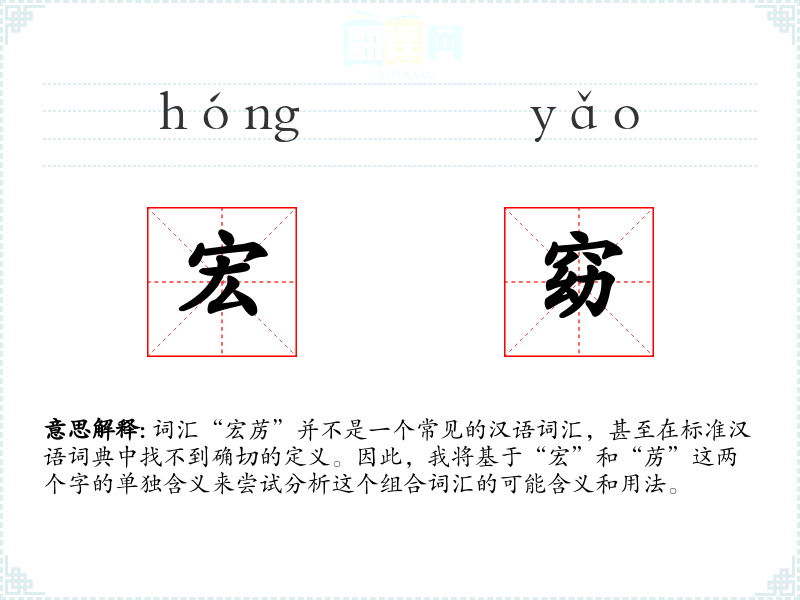 - 宏:通常指宏大、宏伟、广泛或深远的意思。