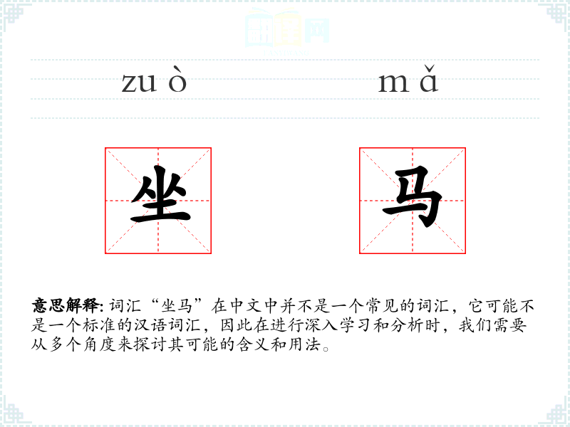 “坐马”这个词汇的字面意思可能是指“坐在马背上”,即骑马的意思。然而,由于这个词汇并不常见,它可能是一个方言词汇、古文词汇或者是某个特定领域的术语。