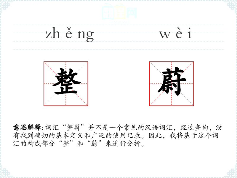 - 同义词:如果“整蔚”意味着整齐且壮观,那么同义词可能包括“井然有序”、“宏伟壮观”等。