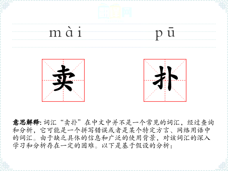 由于“卖扑”不是一个常见的词汇,对其的分析更多是基于假设和推测。在语言学习和表达中,了解和使用标准词汇是非常重要的,这有助于清晰、准确地沟通。如果遇到不熟悉的词汇,应该通过可靠的资源进行查询和验证。