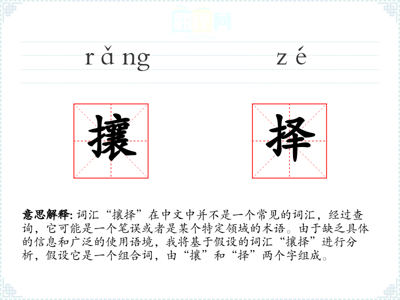词汇“攘择”在中文中并不是一个常见的词汇,经过查询,它可能是一个笔误或者是某个特定领域的术语。由于缺乏具体的信息和广泛的使用语境,我将基于假设的词汇“攘择”进行分析,假设它是一个组合词,由“攘”和“择”两个字组成。