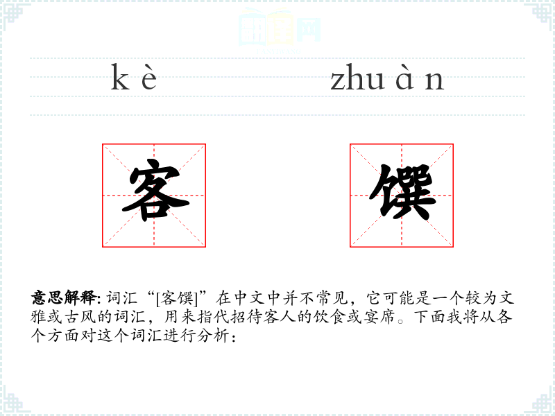 词汇“[客馔]”在中文中并不常见,它可能是一个较为文雅或古风的词汇,用来指代招待客人的饮食或宴席。下面我将从各个方面对这个词汇进行分析: