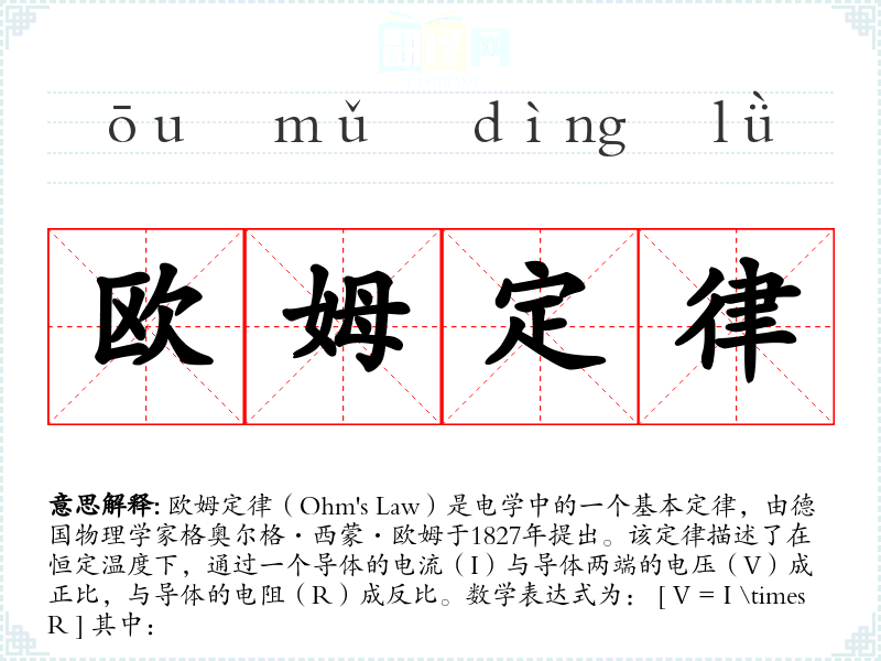欧姆定律是电学中的一个核心概念,对于理解和应用电路原理至关重要。它在科学、工程和技术领域中有着广泛的应用,是现代社会基础设施的基石之一。在学习语言和表达时,理解这样的专业术语有助于更准确地沟通和交流科学知识。