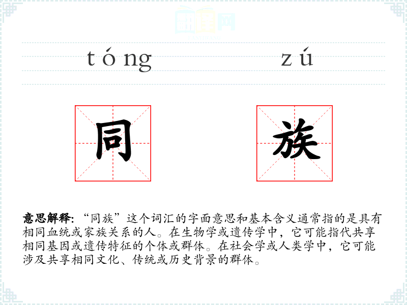 “同族”这个词汇的字面意思和基本含义通常指的是具有相同血统或家族关系的人。在生物学或遗传学中,它可能指代共享相同基因或遗传特征的个体或群体。在社会学或人类学中,它可能涉及共享相同文化、传统或历史背景的群体。