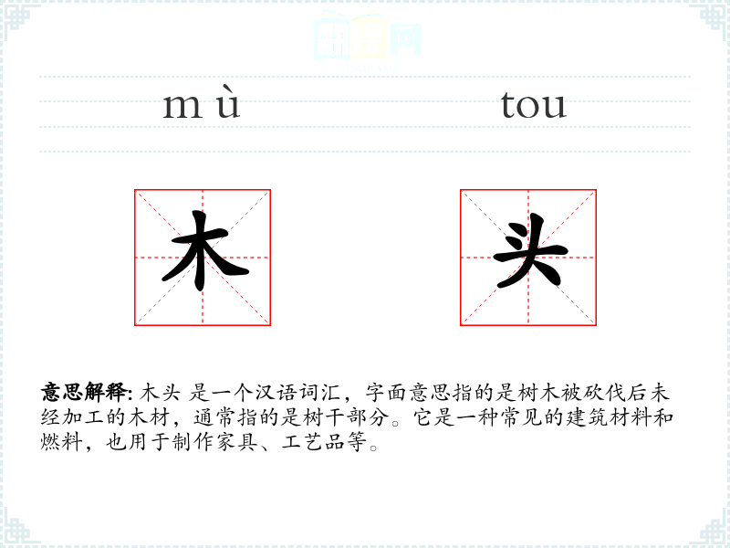 木头 是一个汉语词汇,字面意思指的是树木被砍伐后未经加工的木材,通常指的是树干部分。它是一种常见的建筑材料和燃料,也用于制作家具、工艺品等。