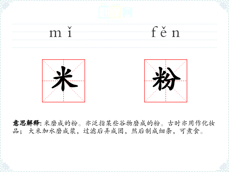 米磨成的粉。亦泛指某些谷物磨成的粉。古时亦用作化妆品; 大米加水磨成浆,过滤后弄成团,然后制成细条,可煮食。