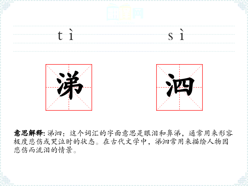 文学语境:在古典文学中,如《诗经》、《楚辞》等,涕泗常用来表达深切的哀伤和悲痛。例如,“涕泗滂沱”形容眼泪和鼻涕如大雨般倾泻,极言其悲痛之深。