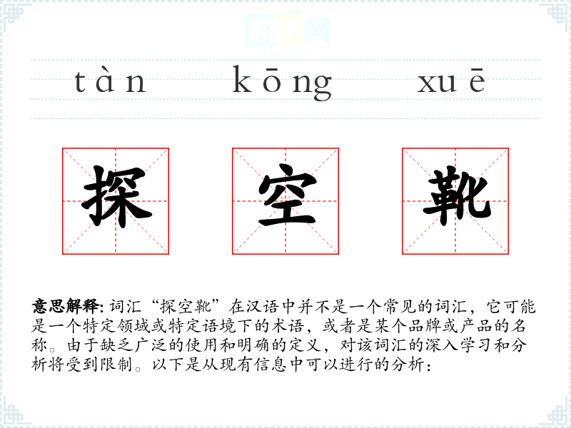 词汇“探空靴”在汉语中并不是一个常见的词汇,它可能是一个特定领域或特定语境下的术语,或者是某个品牌或产品的名称。由于缺乏广泛的使用和明确的定义,对该词汇的深入学习和分析将受到限制。以下是从现有信息中可以进行的分析: