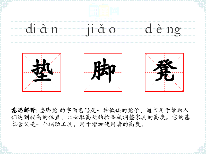 垫脚凳 的字面意思是一种低矮的凳子,通常用于帮助人们达到较高的位置,比如取高处的物品或调整家具的高度。它的基本含义是一个辅助工具,用于增加使用者的高度。