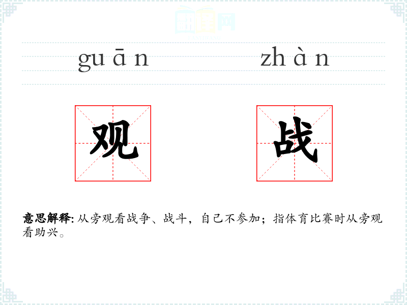 从旁观看战争、战斗,自己不参加;指体育比赛时从旁观看助兴。
