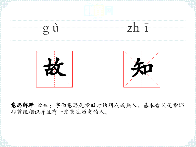 故知:字面意思是指旧时的朋友或熟人。基本含义是指那些曾经相识并且有一定交往历史的人。