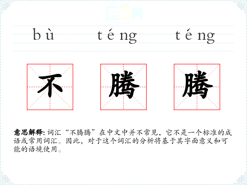 词汇“不腾腾”在中文中并不常见,它不是一个标准的成语或常用词汇。因此,对于这个词汇的分析将基于其字面意义和可能的语境使用。
