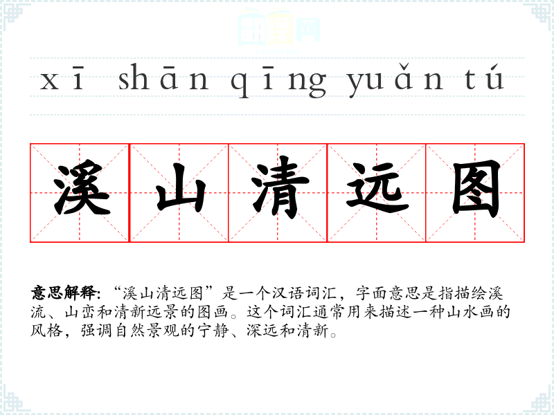 “溪山清远图”这个词汇不仅描述了一种艺术风格,也反映了人们对自然美的追求和对宁静生活的向往。在我个人的语言学*和表达中,它是一个富有诗意和情感深度的词汇,能够丰富我的语言表达和艺术欣赏能力。