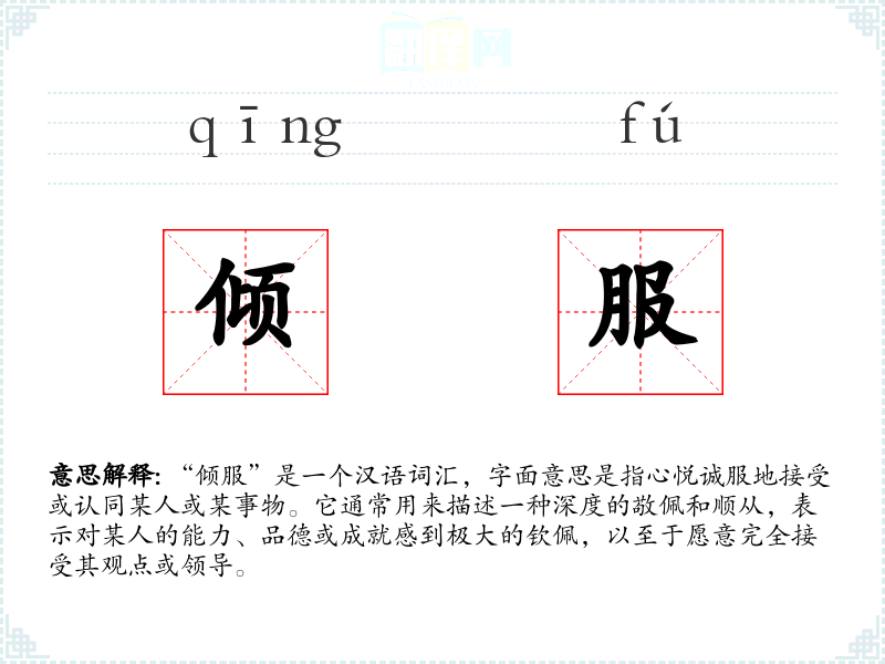 “倾服”一词源自古代汉语,其中“倾”字有倾倒、倾心的意思,“服”则指服从、顺从。随着时间的推移,这个词的含义逐渐固定为对某人或某事物的极度敬佩和接受。