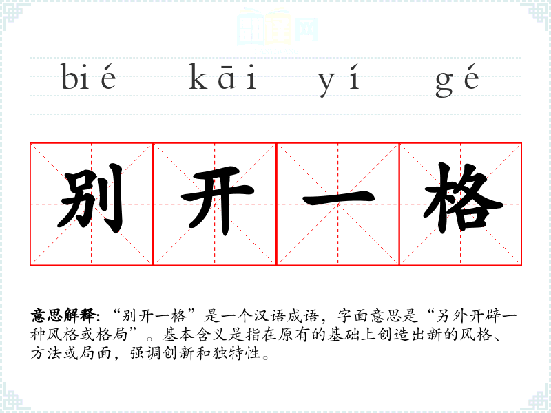 “别开一格”是一个汉语成语,字面意思是“另外开辟一种风格或格局”。基本含义是指在原有的基础上创造出新的风格、方法或局面,强调创新和独特性。