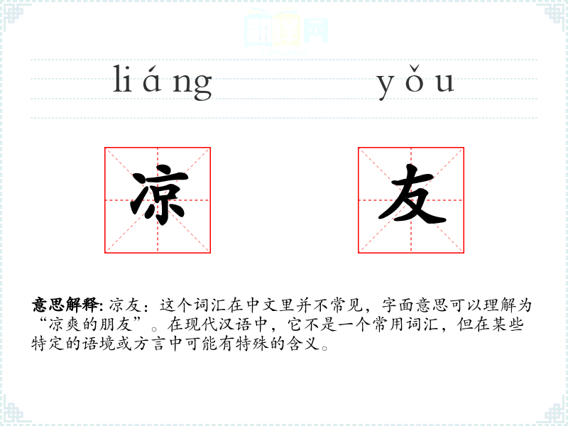 凉友:这个词汇在中文里并不常见,字面意思可以理解为“凉爽的朋友”。在现代汉语中,它不是一个常用词汇,但在某些特定的语境或方言中可能有特殊的含义。