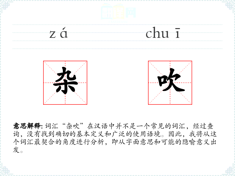 词汇“杂吹”在汉语中并不是一个常见的词汇,经过查询,没有找到确切的基本定义和广泛的使用语境。因此,我将从这个词汇最契合的角度进行分析,即从字面意思和可能的隐喻意义出发。