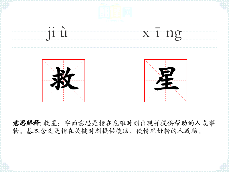 救星:字面意思是指在危难时刻出现并提供帮助的人或事物。基本含义是指在关键时刻提供援助,使情况好转的人或物。