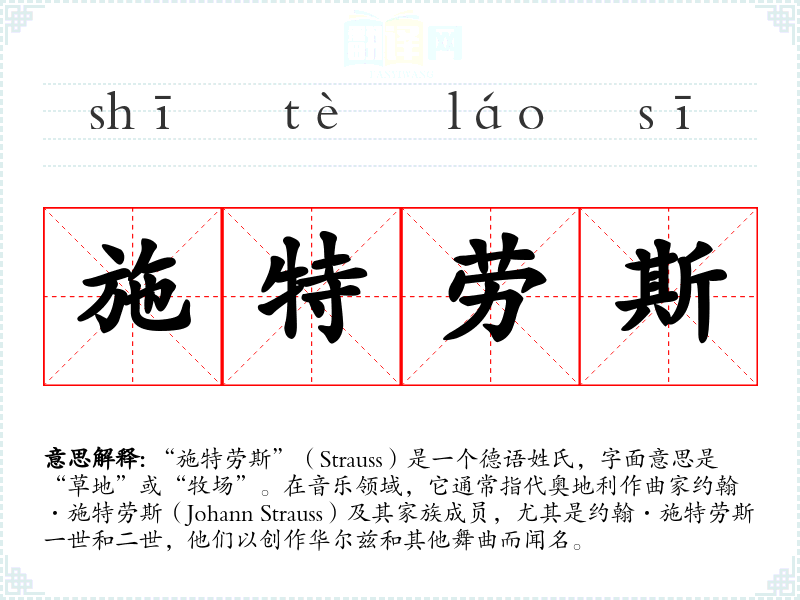 “施特劳斯”(Strauss)是一个德语姓氏,字面意思是“草地”或“牧场”。在音乐领域,它通常指代奥地利作曲家约翰·施特劳斯(Johann Strauss)及其家族成员,尤其是约翰·施特劳斯一世和二世,他们以创作华尔兹和其他舞曲而闻名。