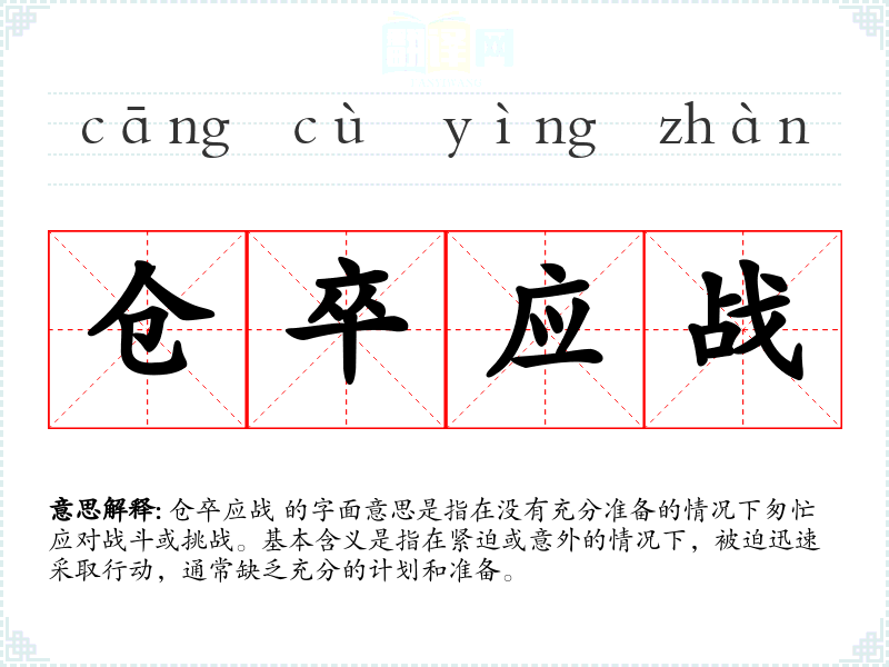 仓卒应战 的字面意思是指在没有充分准备的情况下匆忙应对战斗或挑战。基本含义是指在紧迫或意外的情况下,被迫迅速采取行动,通常缺乏充分的计划和准备。