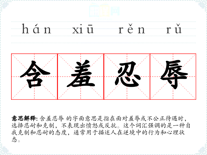 含羞忍辱 的字面意思是指在面对羞辱或不公正待遇时,选择忍耐和克制,不表现出愤怒或反抗。这个词汇强调的是一种自我克制和忍耐的态度,通常用于描述人在逆境中的行为和心理状态。