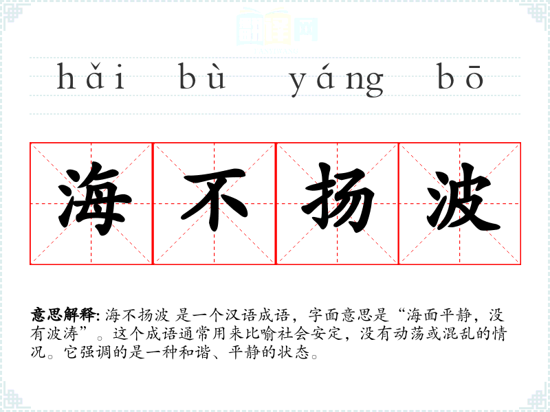 海不扬波 是一个汉语成语,字面意思是“海面平静,没有波涛”。这个成语通常用来比喻社会安定,没有动荡或混乱的情况。它强调的是一种和谐、平静的状态。