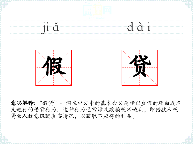 “假贷”一词在中文中的基本含义是指以虚假的理由或名义进行的借贷行为。这种行为通常涉及欺骗或不诚实,即借款人或贷款人故意隐瞒真实情况,以获取不应得的利益。