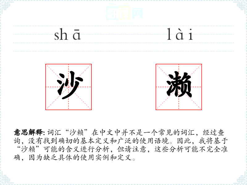 由于“沙赖”不是一个标准词汇,我们无法给出确切的基本定义。它可能是某个方言词汇,或者是某个特定领域的术语。