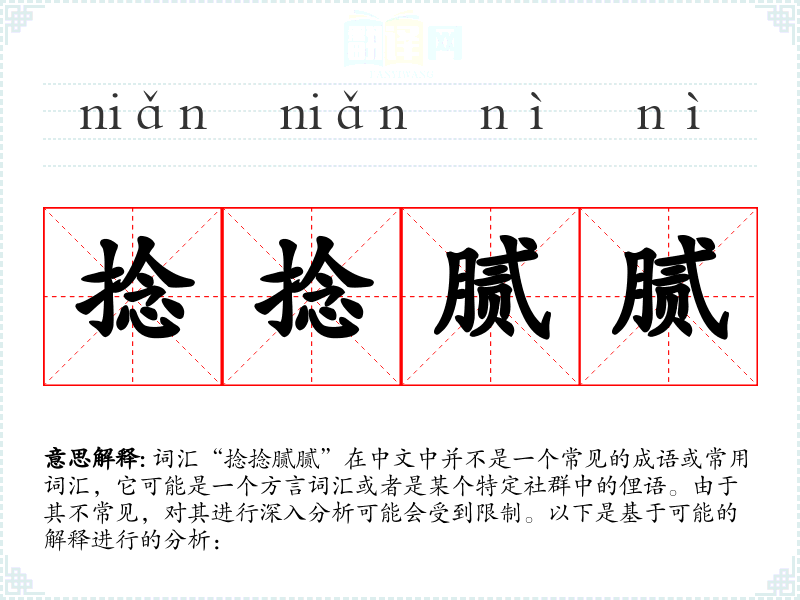 词汇“捻捻腻腻”在中文中并不是一个常见的成语或常用词汇,它可能是一个方言词汇或者是某个特定社群中的俚语。由于其不常见,对其进行深入分析可能会受到限制。以下是基于可能的解释进行的分析: