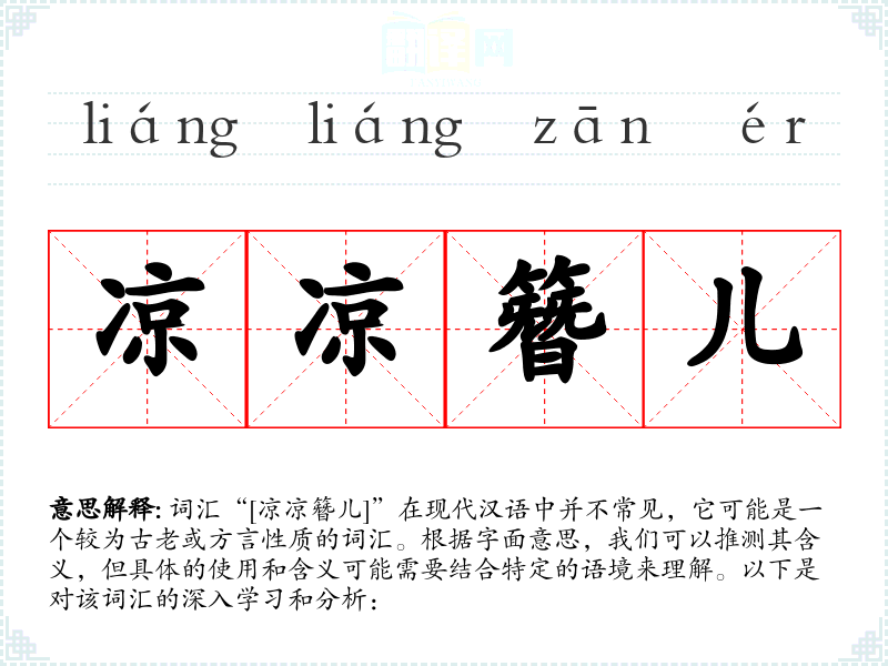 词汇“[凉凉簪儿]”在现代汉语中并不常见,它可能是一个较为古老或方言性质的词汇。根据字面意思,我们可以推测其含义,但具体的使用和含义可能需要结合特定的语境来理解。以下是对该词汇的深入学*和分析: